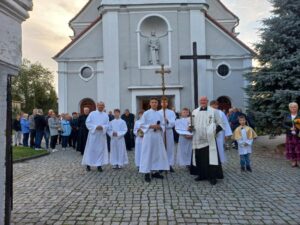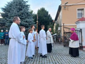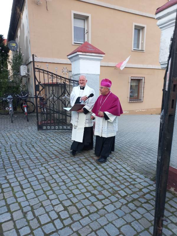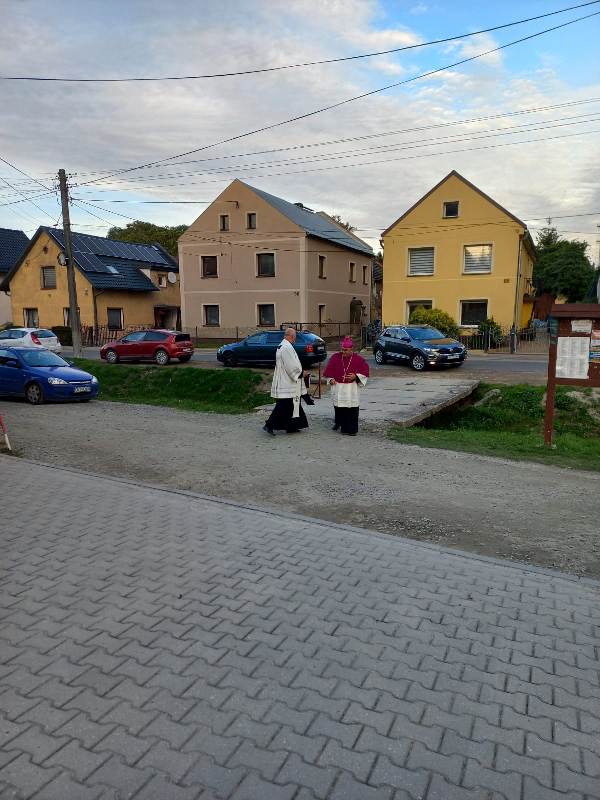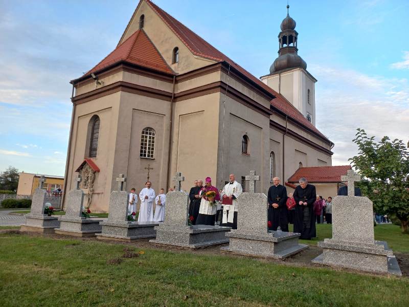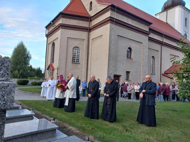 Wizytacją rozpoczęła się od powitania księdza biskupa. Następnie udaliśmy się na cmentarz parafialny. Tam ksiądz biskup Rudolf animował modlitwę przy grobach parafian, kapłanów oraz braci zakonnych.